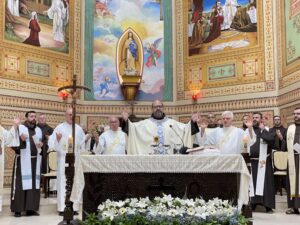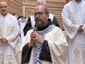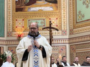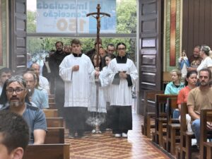 Frei Paulo acolheu a todos os fiéis presentes e aos que acompanhavam pelas redes sociais e ressaltou a alegria de estarem reunidos na igreja matriz de Curitibanos para celebrar as três datas importantes para a Província e para a Paróquia, que está em festa pela Imaculada Conceição.