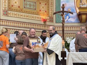 Paroquianos realizaram a entrega de uma lembrança preparada pela comunidade aos frades, na sequência a entrega do quadro comemorativo dos 350 anos da Província Franciscana da Imaculada Conceição do Brasil para cada paróquia do regional. Encerrando com o presidente da celebração eucarística convidando a todos para juntos receber a bênção.