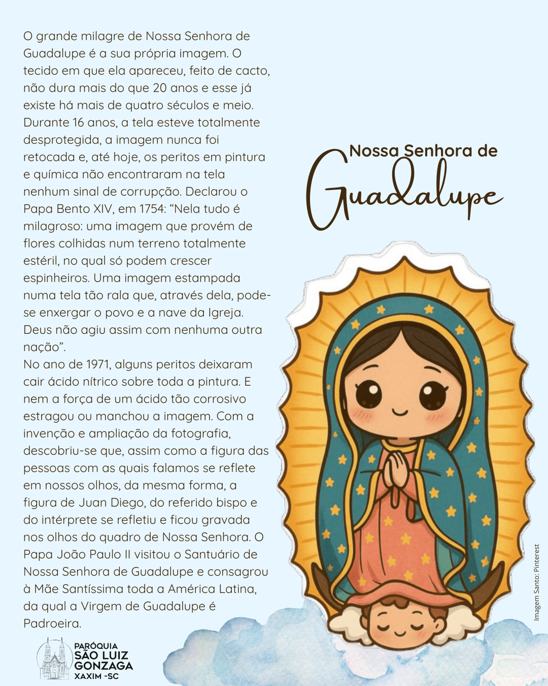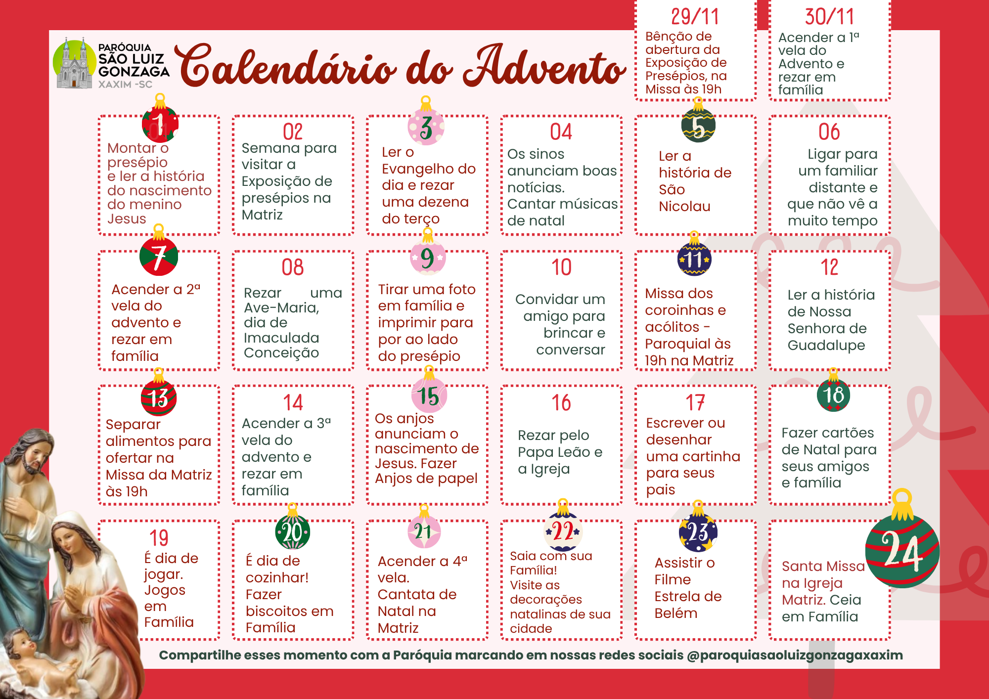 Neste ano, trouxemos uma versão com atividades que remetem ao nosso Calendário Litúrgico, enaltecendo algumas festas como Nossa Senhora de Guadalupe, Imaculada Conceição e os Domingos do Advento, bem como as atividades de Nossa Paróquia.