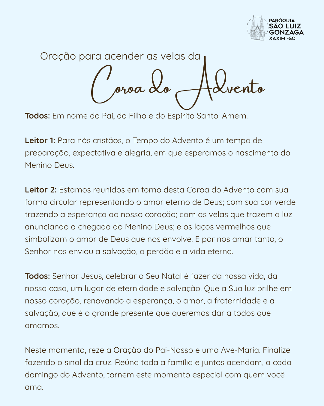 Neste momento, reze a Oração do Pai-Nosso e uma Ave-Maria. Finalize fazendo o sinal da cruz. Reúna toda a família e juntos acendam, a cada domingo do Advento, tornem este momento especial com quem você ama.