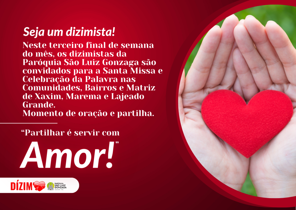 Neste terceiro final de semana do mês celebramos em ação de graças aos dizimistas da Paróquia São Luiz Gonzaga. A Santa Missa na Igreja Matriz e as Celebrações da Palavra nas comunidades, bairros de Xaxim, Lajeado Grande e Marema lembram dos dizimistas.