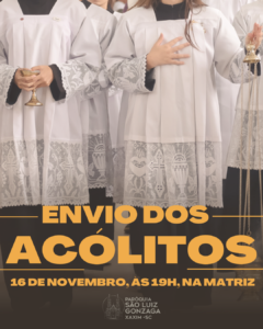 No domingo, 16 de novembro, às 19h, na Matriz será celebrado o envio dos acólitos da Paróquia São Luiz Gonzaga. Este é o primeiro grupo a ser formado na Paróquia São Luiz Gonzaga.