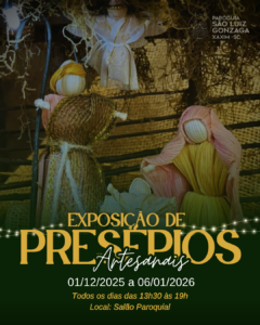A Paróquia São Luiz Gonzaga realiza neste ano a Exposição de Presépios Artesanais. A abertura será no domingo, 30 de novembro, às 19h na Matriz com bênção. A exposição acontece no salão paroquial, local onde estão sendo realizadas as missas da matriz. A entrada é gratuita e a visitação pode ser realizada todos os dias das 13h30 às 19h.
