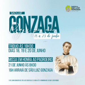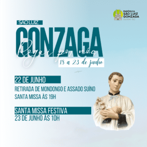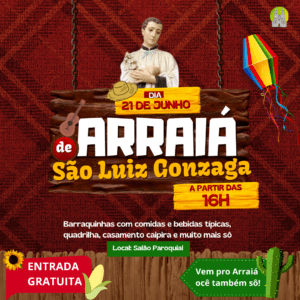 No dia de São Luiz Gonzaga, 21 de junho, feriado municipal, iniciamos as comemorações ao Santo com Santa Missa, às 8h30, na Igreja. A tarde, a partir das 16h, Arraiá de São Luiz Gonzaga no salão paroquial, vai ter quadrilha, comidas e bebidas típicas, casamento caipira e muita diversão.