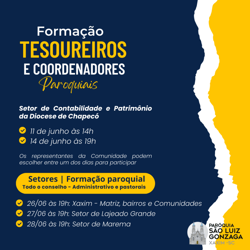 No 11 de junho às 14h e no dia 14 de junho às 14h , os membros do conselho podem escolher um dos dias para participar. Esta formação inicial acontece com o pessoal da Cúria Diocesana, setor de contabilidade e patrimônio.