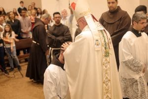 No momento central, Frei Danilo se colocou de joelhos e, em silêncio, bispo e presbíteros impuseram as mãos sobre ele, seguindo a prece de ordenação feita pelo bispo. De pé, o ordenado foi revestido por Frei Gilson Kammer e Frei Jacir Zolet, da Fraternidade São Luiz Gonzaga, de Xaxim. As mãos ungidas e amarradas com uma fita, foram desatadas por sua tia Cidinha, que recebeu a primeira bênção. Os pais de Frei Danilo são falecidos. Em seguida, Dom Eduardo, entregou a patena e o cálice, exortando-o a conformar-se ao mistério da Cruz do Senhor, pondo em prática o que vai celebrar.
