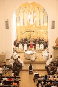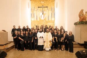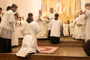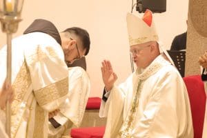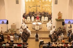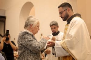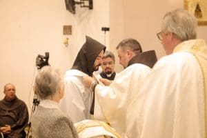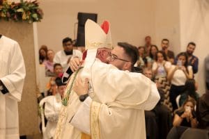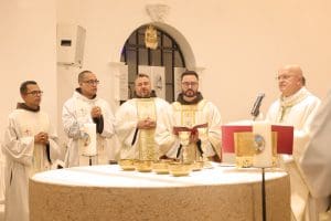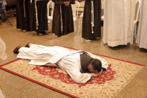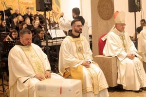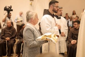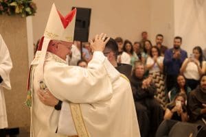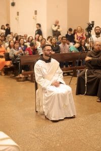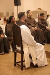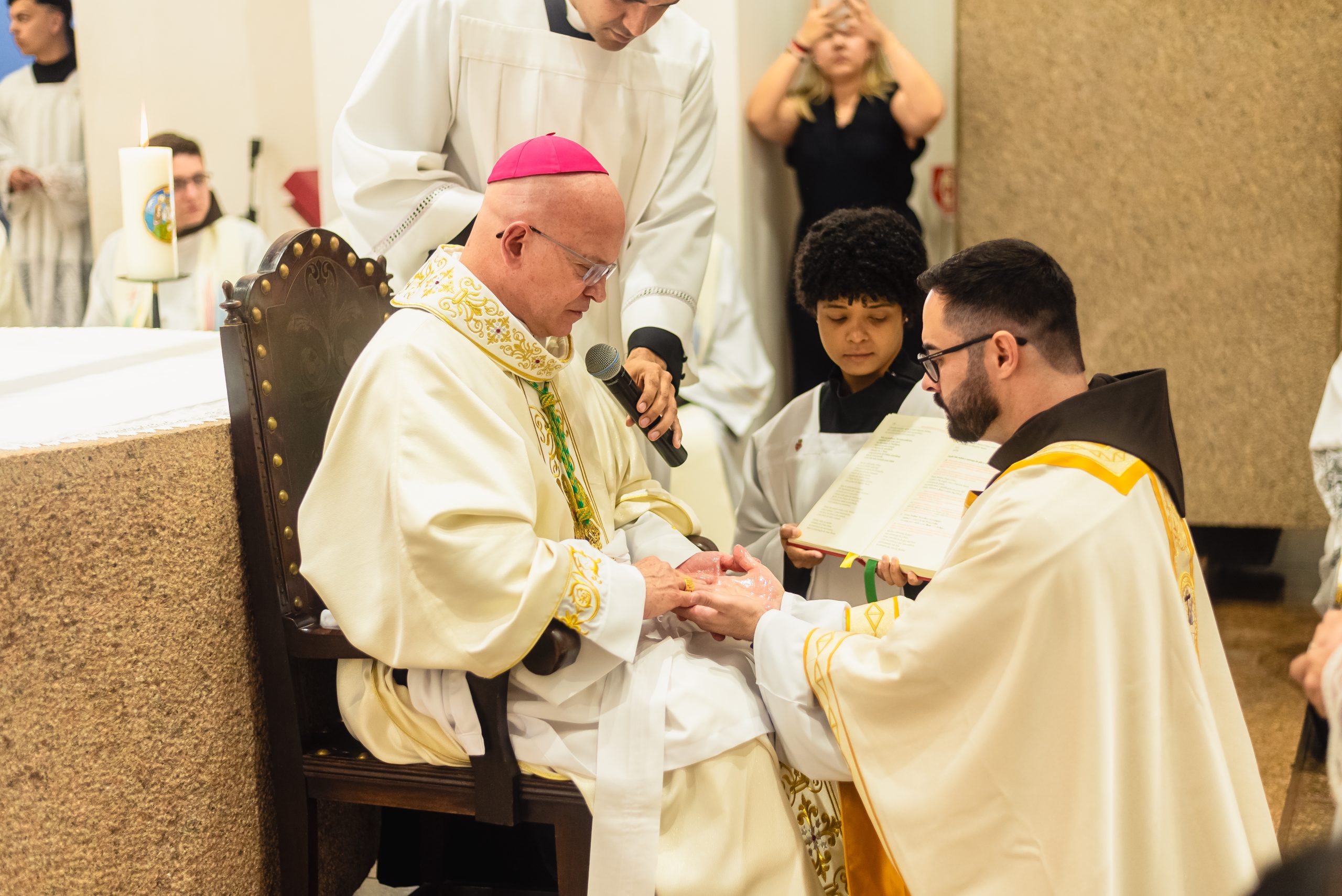 Frei Danilo recebeu os abraços de todos os presbíteros, com quem dividirá o ministério, os padres e confrades presentes. Assim, subiu ao presbitério para concelebrar pela primeira vez a liturgia Eucarística.