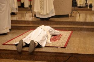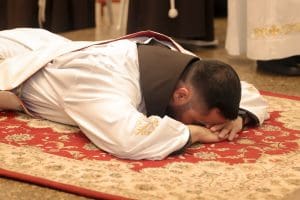O rito seguiu, quando o bispo convidou, o eleito, então, a declarar perante a Igreja seu propósito de desempenhar a missão de presbítero pelo ministério da Palavra, pela celebração da Eucaristia e da reconciliação, pela fidelidade ao dever da oração e pela entrega pessoal a exemplo do Cristo Senhor. Frei Danilo disse sim ao ministério presbiteral, suas funções e o modo de vida. Prostrou ao chão, como sinal de total entrega a Deus, enquanto Frei Felipe Carreta iniciou a Ladainha de Todos os Santos.