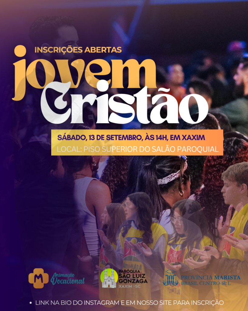Na Paróquia São Luiz Gonzaga, o Jovem Cristão acontece no dia 26 de julho das 14h às 16h, o evento é acompanhado pelos Irmãos Maristas. Você pode fazer a sua inscrição pelo link: