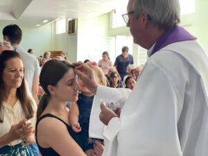 Após a sua reflexão, o rito de imposição das cinzas. Ao final da Celebração Eucarística o convite a Missa das 18h30 com abertura da Campanha da Fraternidade na paróquia.